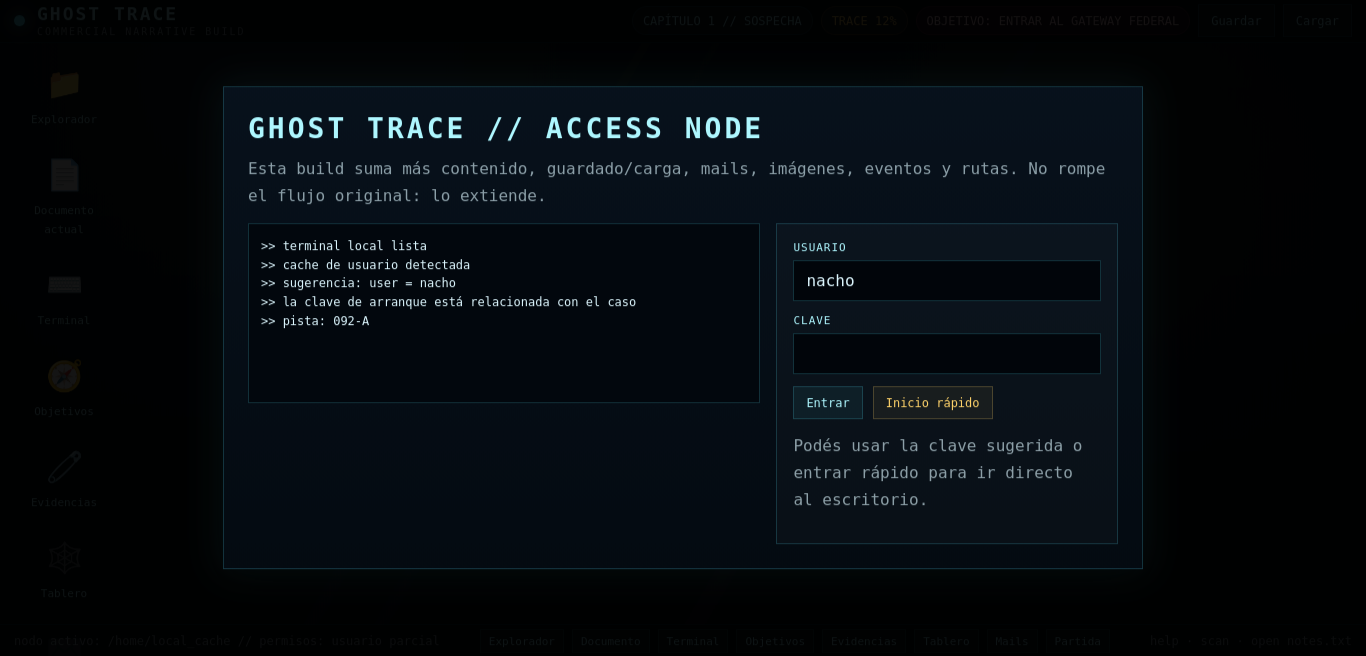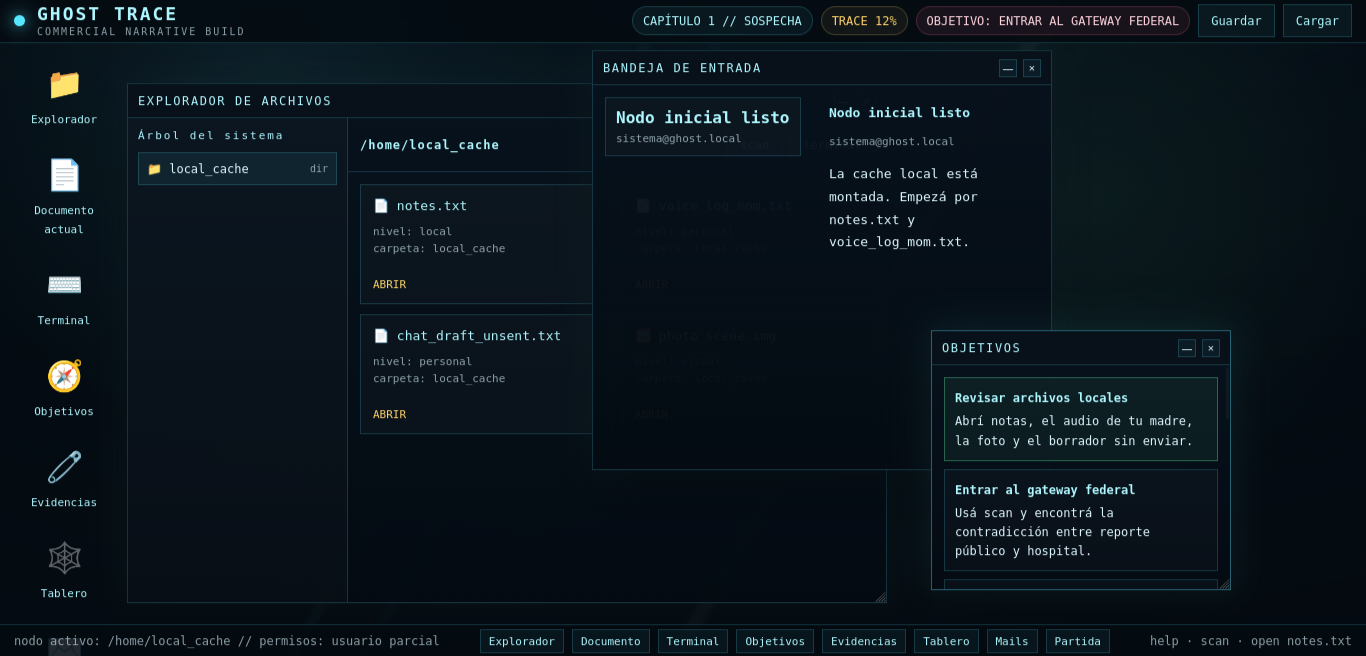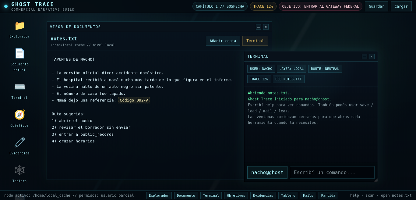 Ghost Trace is a narrative desktop thriller about grief, hidden evidence, and institutional cover-up.